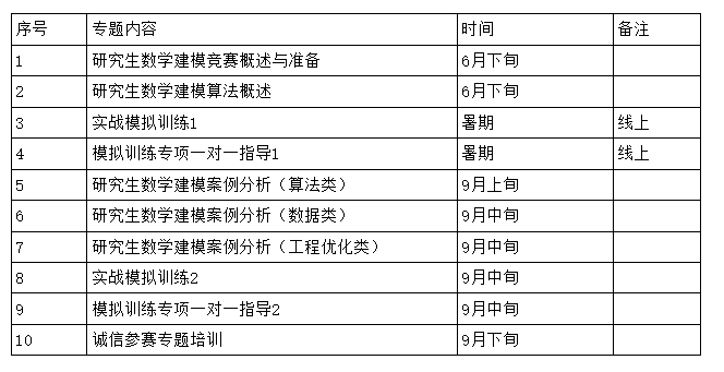 为了助力同学们更好地参赛,vwin德赢AC米兰合作研究生数学建模指导团队根据同学们的报名情况,拟安排如下培训及训练: