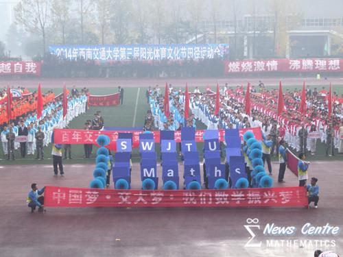 The opening ceremony of the third sunshine sports culture festival formally began at 8:30. The first part is phalanxes’ displaying. First through the podium is the school faculty team. They walked slowly with vigorous figure. Positive spirit showed jiaotong university’s self-improvement. Followed by the team of every schools, they shouted their own slogans. Students of the School of Mathematics wore tracksuits which are in color of yellow and blue. They used elaborate design to show the mysteries of mathematics. At last, they treaded neatly to exit with the slogan, “Jiaotong university in hundreds of years, golden math, cultivate talents to rejuvenate the Chinese nation ,unremitting self-improvement.” On the other hand, the students in the auditorium shouted for our team and cheer for them.