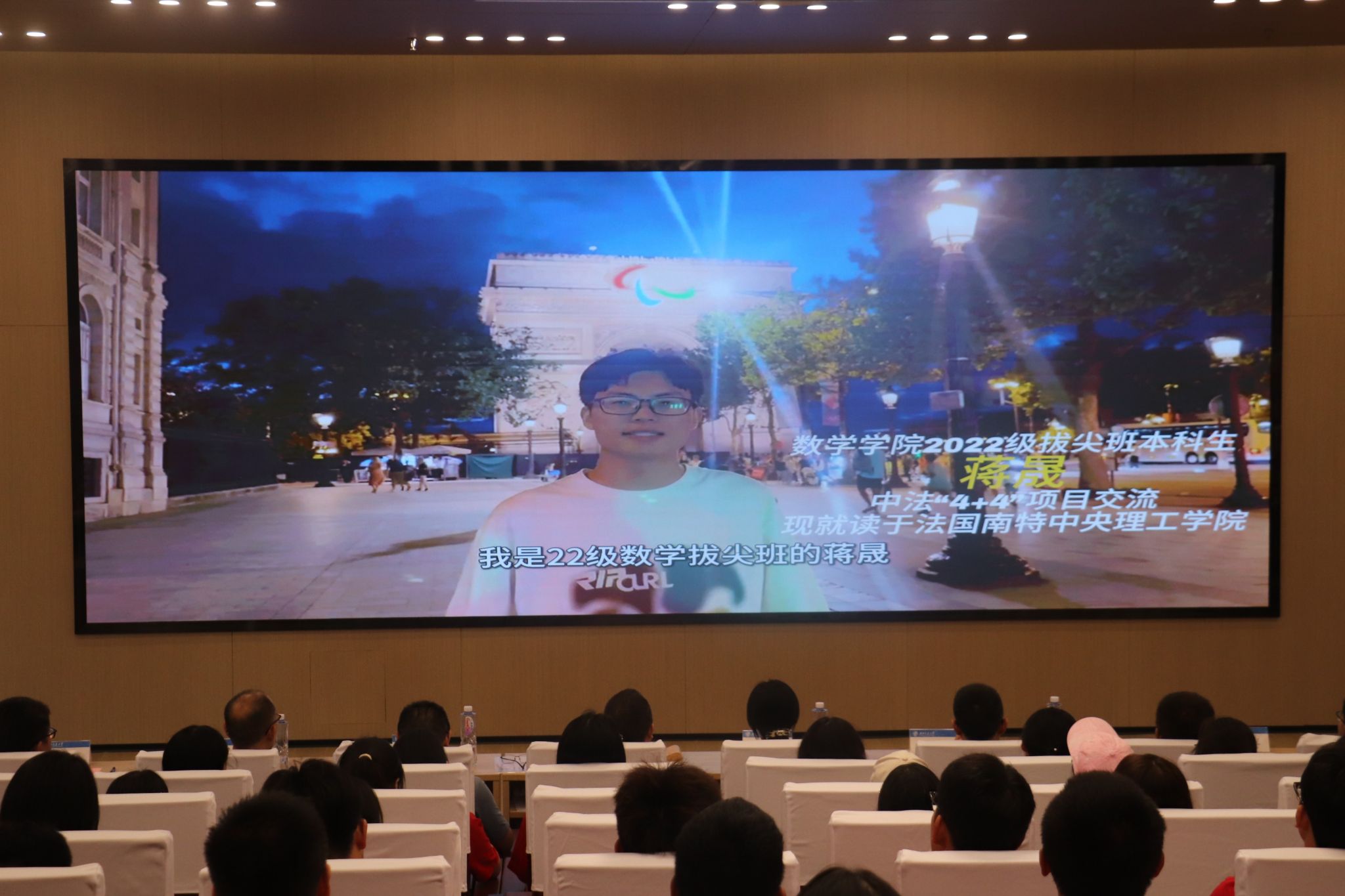 议程第三项,教师代表孟华副教授发言。孟华副教授介绍了学院的基本情况和数学学科的发展历程。他指出,学院始终秉持“朴素、艰苦、挑战、进取”的学风,所有学术报告均面向全体学生开放,并搭建广阔的学习与活动平台,激励一代又一代数学人不断前行,茁壮成长。孟华副教授还特别展示了优秀学长的精彩履历,以此激励在座学子努力学习,勇攀高峰。孟华教授期望,同学们能始终保持少年情怀、满腔热血,勇担时代责任,拥有一段快乐健康、卓有成效的大学生活。